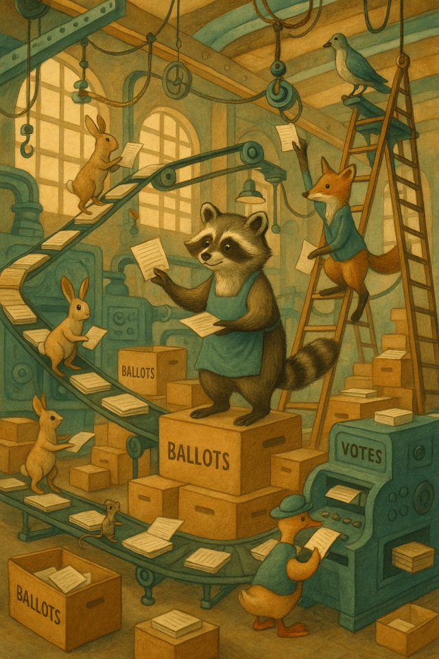 I devised the idea for Rico while counting vote-by-mail ballots in a warehouse. The movement of paper and boxes and the sounds of tabulators inspired me. I envisioned a whimsical universe reminiscent of Willy Wonka’s world, where animals are trained to perform all the tasks. With the help of conveyor belts, pulleys, and tall ladders, counting votes would be executed with the ease and grace of a performance from Swan Lake.